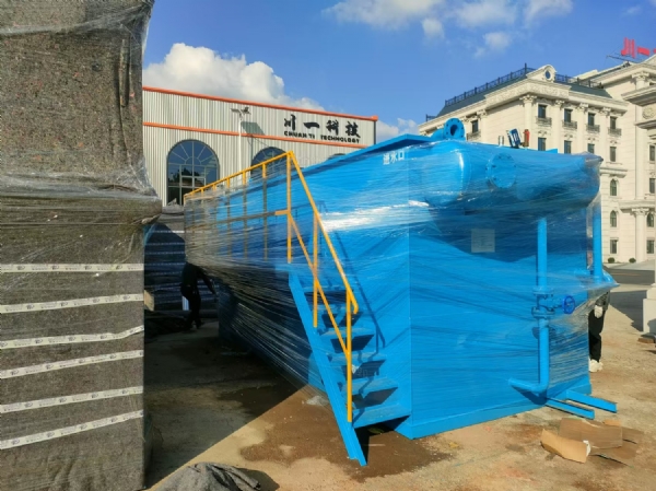 溶氣氣浮機(jī)采用新型的溶氣設(shè)備——微氣泡發(fā)生器,代替?zhèn)鹘y(tǒng)的引氣設(shè)備向水中溶氣,并在氣浮區(qū)域內(nèi)安裝若干斜管組,包括箱體、刮渣機(jī)、螺旋出料機(jī)共同組成一個完整氣浮凈水裝置。當(dāng)懸浮物的密度大于1時,由于安裝了斜管組,就會產(chǎn)生淺池沉淀的效果,從而使沉淀在紊流條件下進(jìn)行。粒徑教大、比重教大的不易上浮的污染物質(zhì)就會集中到集泥區(qū)里,達(dá)到凈水的目的。